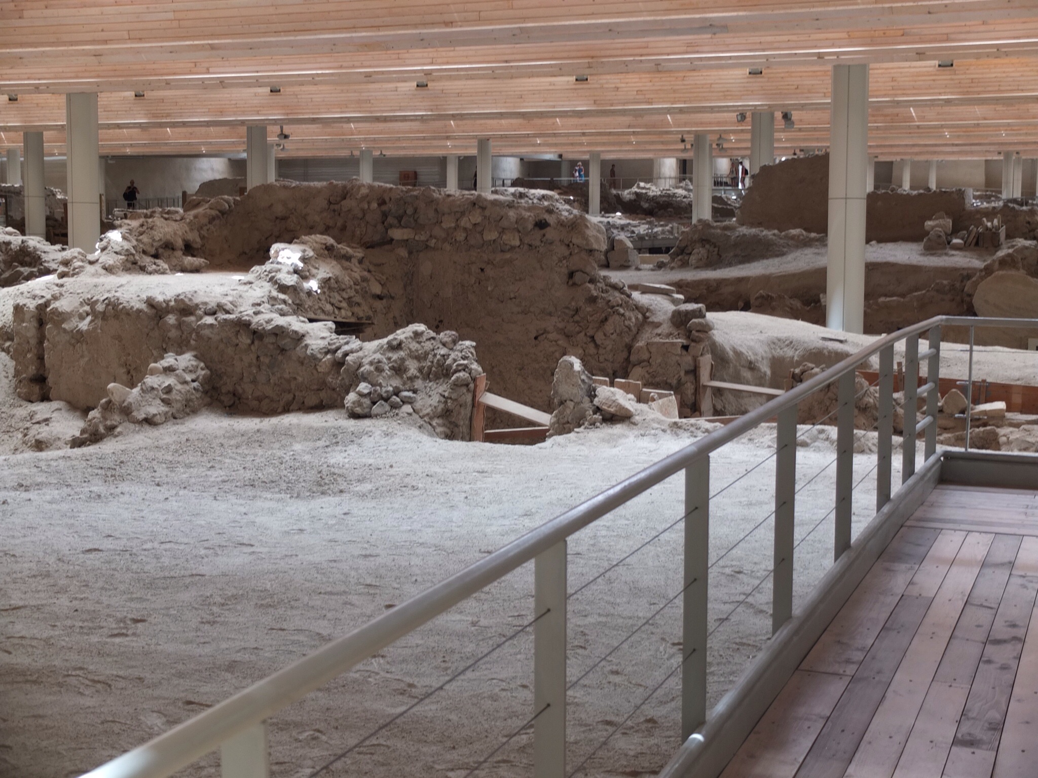 Taxi arrives and I’m off to Akrotiri. No talkie talkie with the taxi driver. No worries I’ll talk to myself as I walk around the ruins. Effectively the ruins and the resultant excavations are housed or covered in an elaborate framework. It wasn’t always like this. Not long back the place was falling apart. As a result, all of the Frescoes from the walls were relocated to major museums in places like Athens. I’m disappointed by this. I consider a tour of the ruins from a funky female character passing herself off as a tour person. How much for a tour/ explanation of all of this? 60 euros. Um, no thanks. She looks more like an entrant in the Eurovision Song Contest. In I go. What a strange concept. Do the excavations and then cover it all up and keep excavating in the same spot. Finding it hard to make sense of all of this. A lot of rooms. A lot of corridors. And yes, check out those massive storage vessels. Hard to believe this was all happening in the 4th millennium BC. And of course there is the lost city of Atlantis angle on all of this. Apparently for quite some time scientists felt that that Atlantis was under water in this area. Contemporary thinking about Atlantis has scientists looking above ground in and around the prehistoric ruins of places like Akrotiri where I was today. Whilst waiting for the taxi I walk down to the end of the road to view the beach. No sand man. A young boy spruiks boat trips to the various beaches. Black beach, Red beach and White beach. Mmm.
