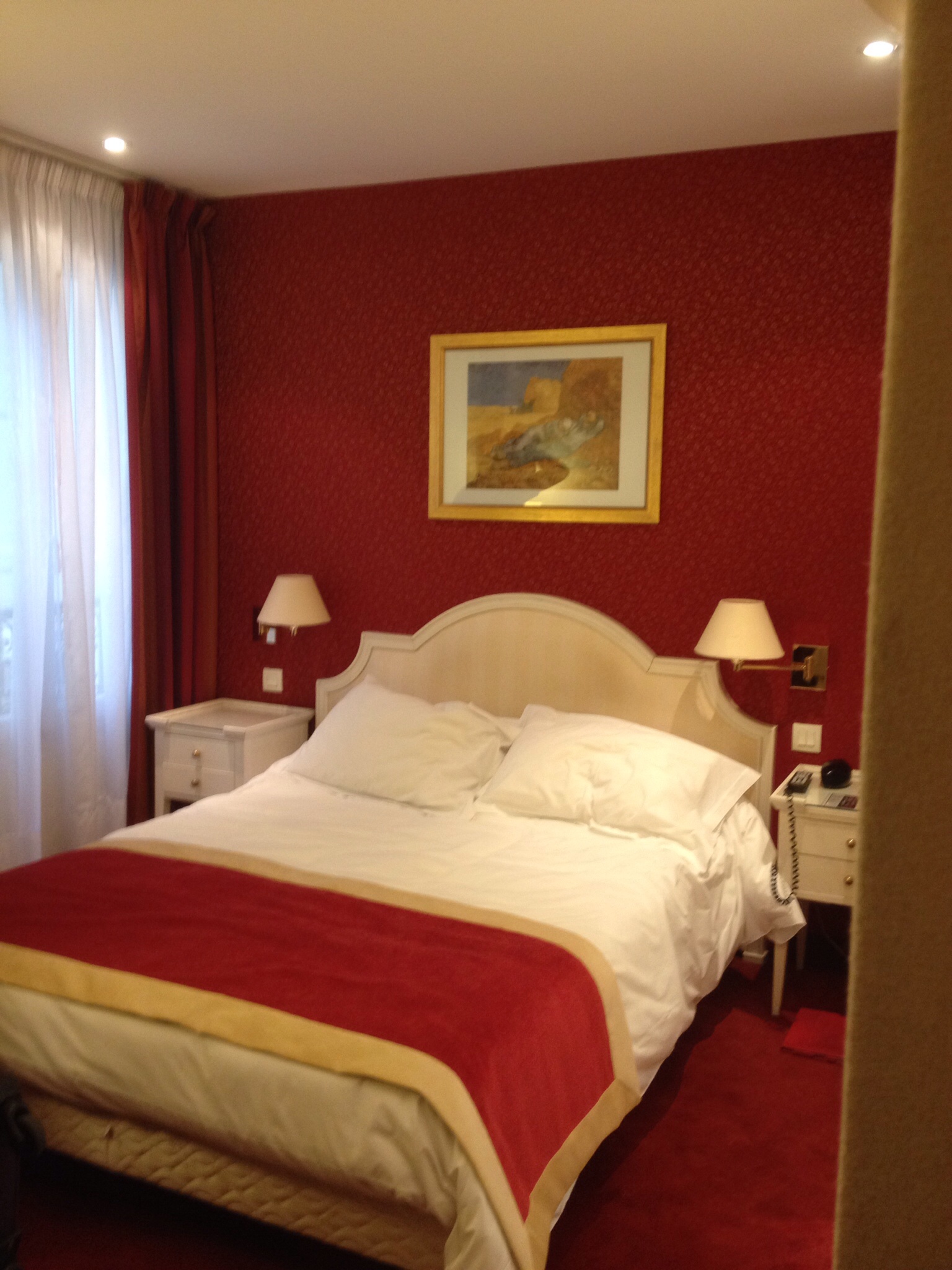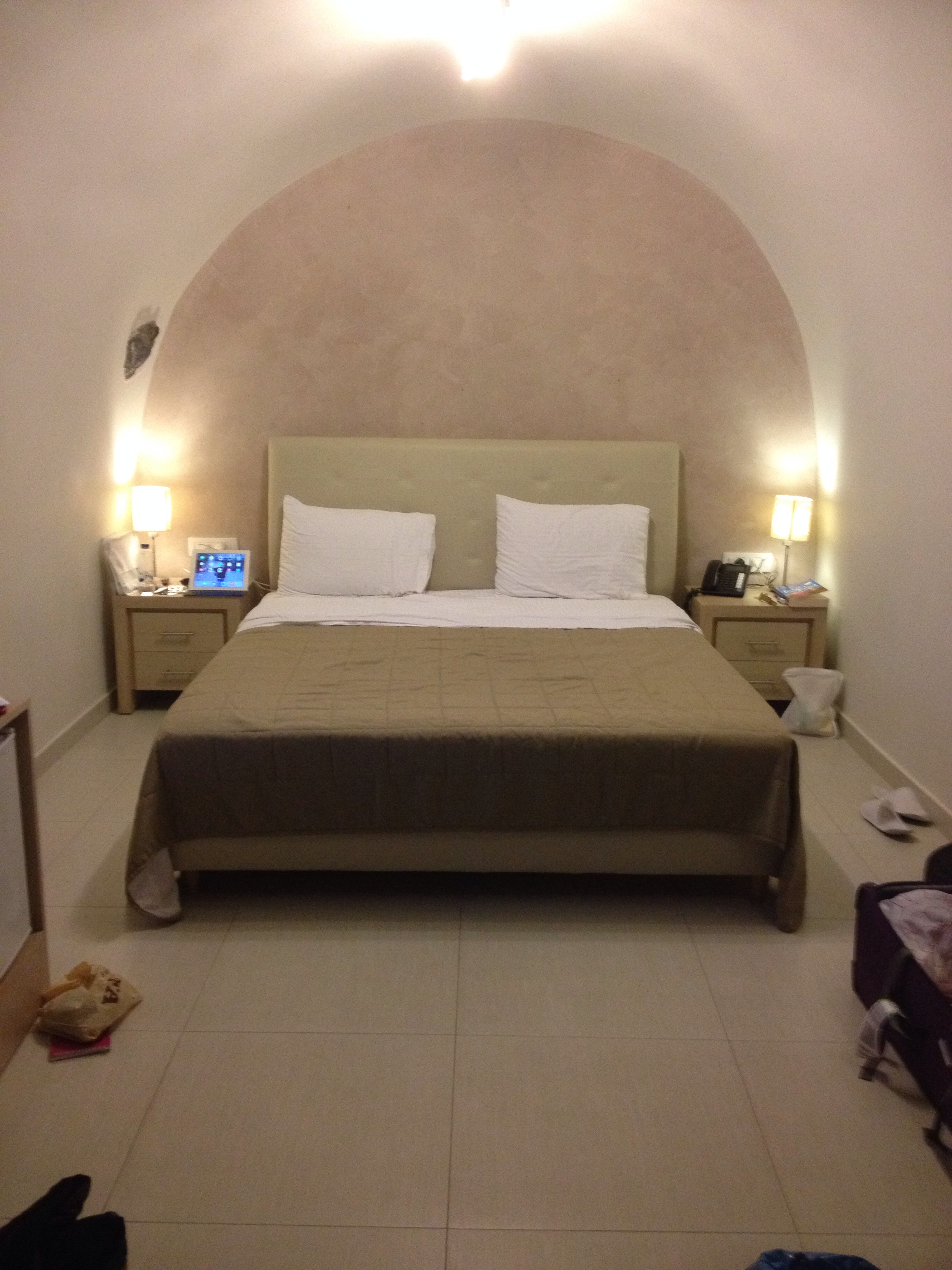 •June 21, 2014 • 2 CommentsPenultimate breakfast. Lets see what our mates can do with the toast. Ah, oh. One sided toast again. I ring the Minister responsible for the services sector of the Greek economy and run the scenario past him. He actually has never heard of toast and asks whether it is an industrial chemical. I explain its bread related and send him a youtube video of a toaster in action. He says he’ll get back to me. Nothing. Anyway, a cruisey vibe for our final day in Santorini. We talk with the older representative from our Melbourne office. All ok. Check the suitcases and check our finances. All good. We head up to concierge to book a taxi for tomorrow morning to the airport. Still a bit windy here at the moment. We catch the shuttle into Fira for our final walk around. First off its a visit to our little coffee spot. Throw in a bit of lunch. The girl who has served us each time, upon learning that it is caputnik for our trip, says we should come back next year for 3 months. I don’t even try to explain the impossibility of that scenario beyond tattslotto. We pick up a few more Santorini keepsakes. I opt for a Red Donkey T Shirt to go with my Red Donkey beers just purchased. Sue sorts out an interesting T Shirt for someone at our Melbourne office. The shopping scene has been a pleasant surprise. We bump into some donkeys at the top of the shopping centre. I snap Sue with one of the little guys. I give the donkey guy 5 euro for the privilege of setting up a photo opportunity. My decision. A feeling of guilt. I suspect its pretty tough for some of the people on the island. Back to the shuttle pick up point. This transport convenience been soooooo good. By bye to Bobbly the driver of the shuttle bus. Back at our room its time to pack up some bits and pieces. Oh no, my BBC mug has been broken. Damn it. What a special day that was in London. I try and order a replacement online. We order in our dinner. What a trip. Final blog entry. Some snaps below of our the different rooms that we had at each of our different stops. All very comfortable, some smaller than others.
