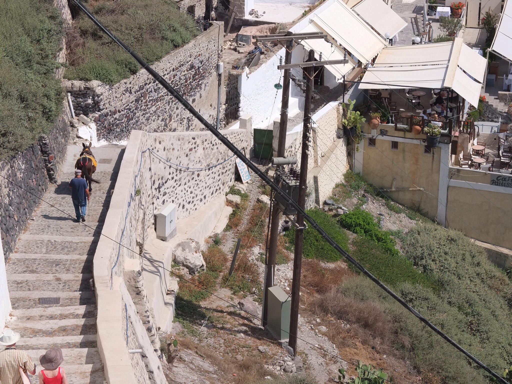 Lets go retail. Sue is on the lookout for a gold chain. We head into a shop and strike an interesting character. After an Australian/ Greek discount of significant proportions (?) we walk out with a chain and an attached understated pendant etched with the Greek symbol of the key to eternal life. I like it and so does Sue. We drift on to another shop to look for a ring, but baulk at 6900 euro. Up the hill at the top of town to checkout the cable car. Wow what a view. We notice that the donkeys are still being used to make this same journey up and down the hill here. Technology doesn’t win out, but its pretty hot on the cliffs for these donkeys. Back to the hotel bus shuttle point. Time for a swim at our hotel. Drinks by the pool. Kickback. Aren’t we kicked back already? Clean up and change for dinner.